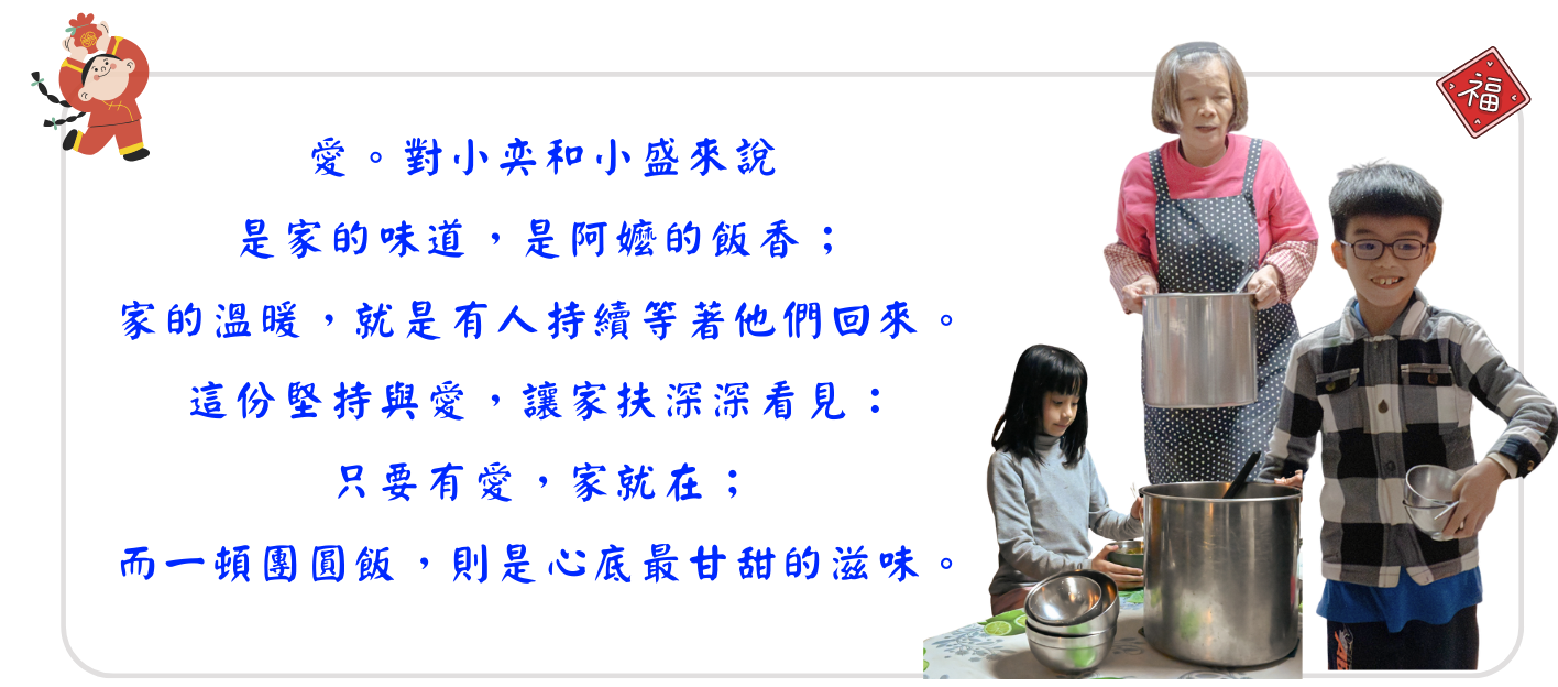 小奕和小盛幼年時期,因父母無法提供良好的成長環境,曾短暫由社福單位安置照顧。不過阿嬤期盼兩個孫子能感受到更多家庭溫暖,因此毅然將他們接回身邊。