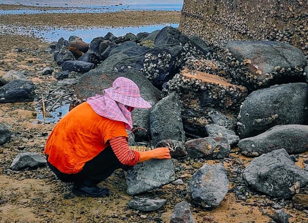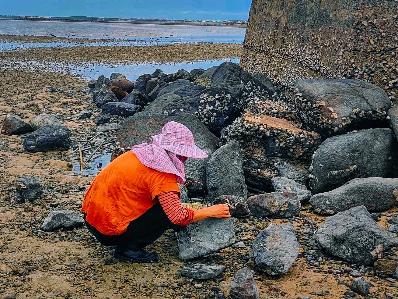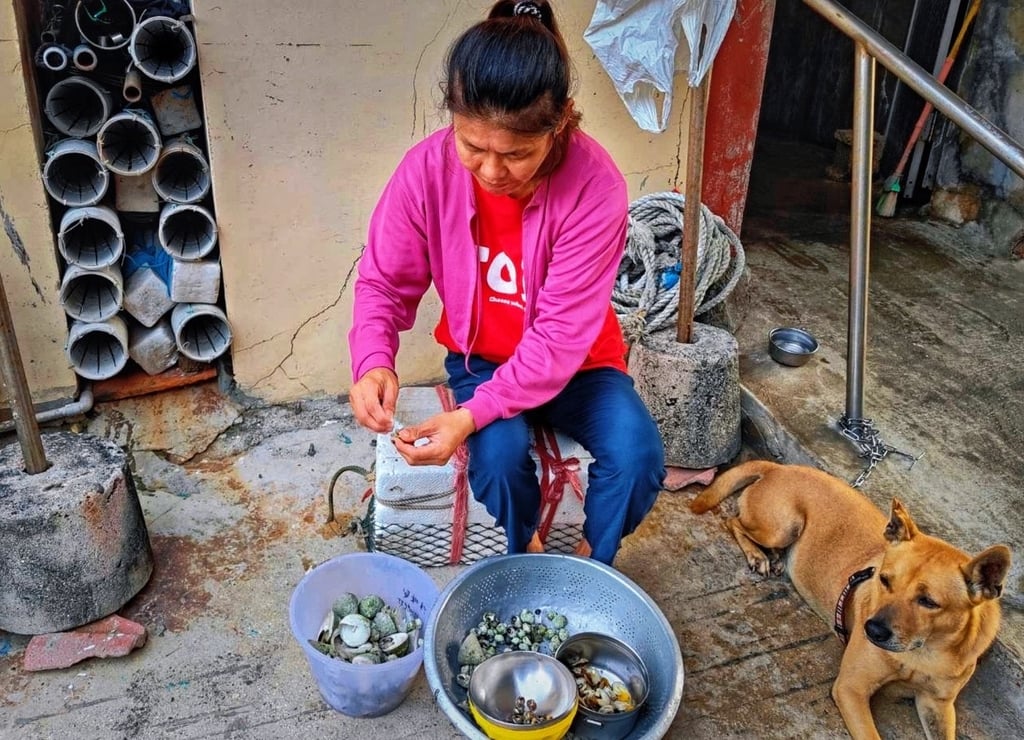 「今年擴大就業時間很短,加上二級離島工作機會不多,為了照顧現在讀國中的女兒,我會看潮汐狀況去海邊撿珠螺,撿回來清洗、煮熟、挖肉、裝盒,再拿去市場賣,八斤的量處理完之後,大概只剩一斤多能賣錢,每月也就幾千元收入,加上氣候在改變,珠螺產量越來越少,天氣不好也無法去撿,生活實在不容易…」