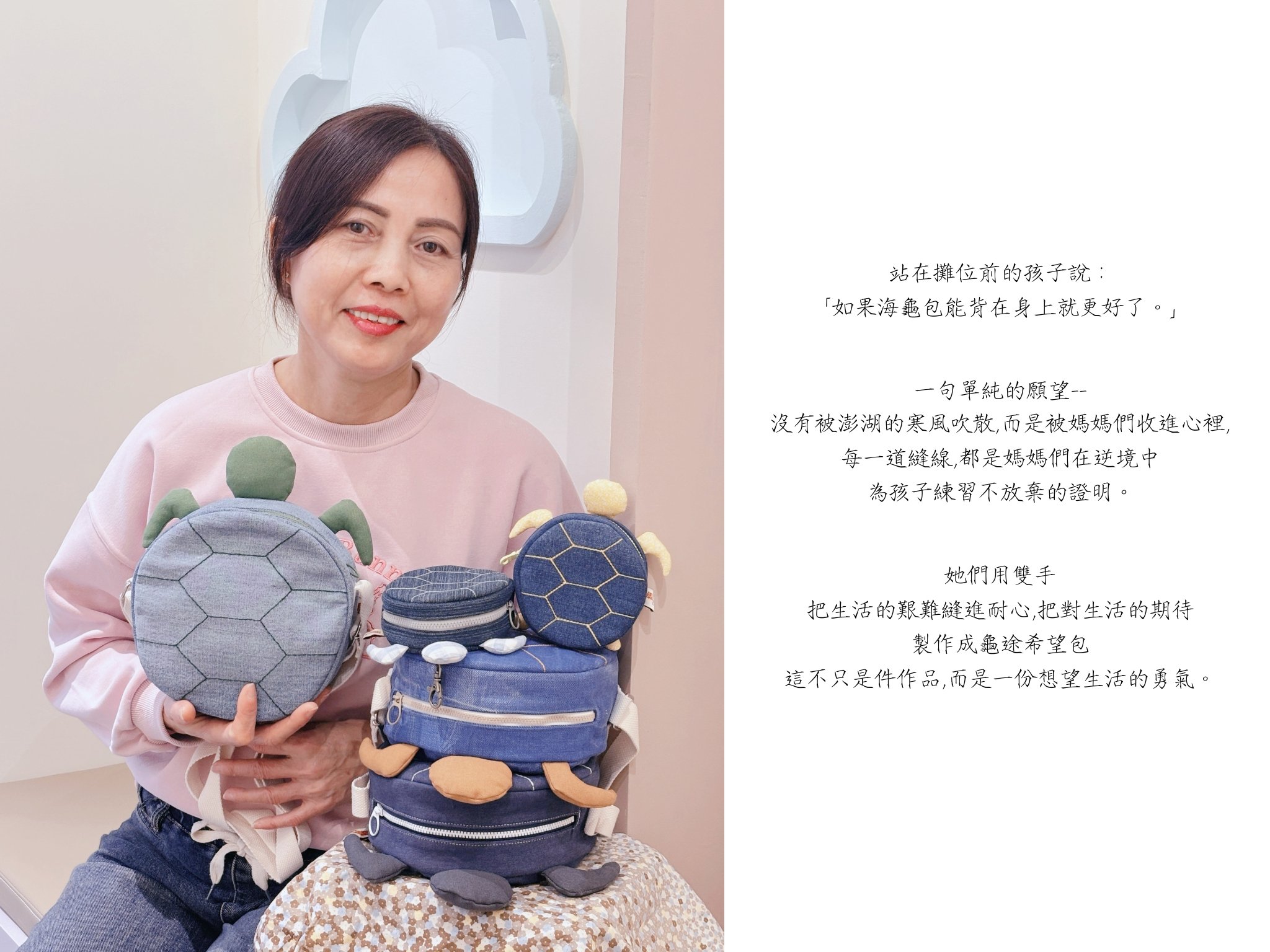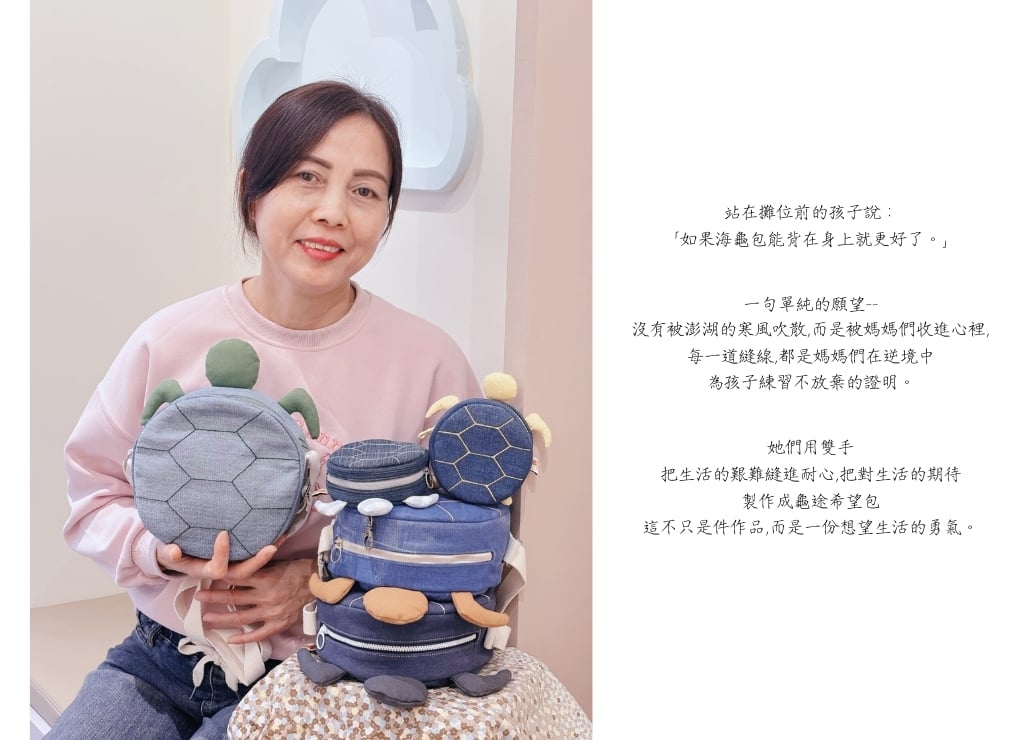 逆流小魚以「二手衣改造」為起點,透過技能培養與設備扶助,讓小魚媽媽在照護家庭之餘,增加穩定收入。小魚媽媽鍥而不捨地學習,從生疏到熟練、從研發、生產、銷售的艱辛過程,是為一個愛家的堅持。