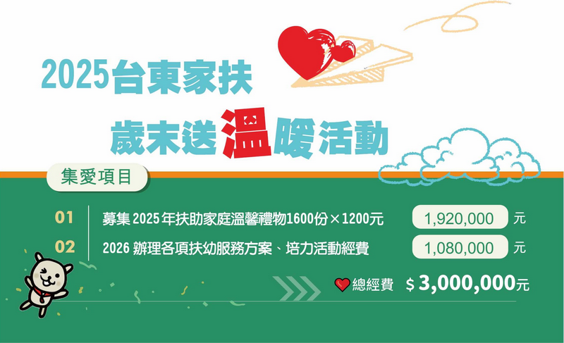 台東家扶中心將於12月06日(六)分別在台東中心、成功、關山、大武服務處同步辦理『2025歲末送溫暖活動-扶幼有愛,韌性綻放』,期待透過歲末送暖的活動傳遞社會大眾的愛,邀起您一起攜手扶幼,帶給處在艱難困境中家庭溫暖與關懷,讓家庭堅定信心與韌性綻放,讓兒童擁有夢想,迎向未來。